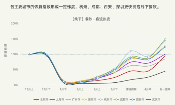 友盟+報(bào)告印證了我的觀點(diǎn)。上述8個(gè)主要城市,直到4月中下旬,杭州、成都、西安、深圳線下餐飲客流熱度才恢復(fù)到疫情前水準(zhǔn),并在五一假期來了波小高潮。相比之下,北上廣擁抱線下餐飲的速度更慢,直到五一假期,北京、上海才勉強(qiáng)接近疫情前水準(zhǔn),廣州恢復(fù)到疫情前的七八成,武漢則不到一半。