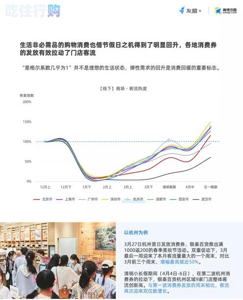 盡管不少剁手黨在疫情期間習(xí)慣線上消費(fèi),但線下商超獨(dú)特的體驗(yàn)優(yōu)勢(shì),使其依然受到青睞,加上各地發(fā)放消費(fèi)券,有效拉動(dòng)門店客流。杭州商場(chǎng)客流熱度在清明假期率先恢復(fù)至疫情前水準(zhǔn),除武漢外,其他城市則在4月中下旬到五一假期陸續(xù)重現(xiàn)昔日榮景。