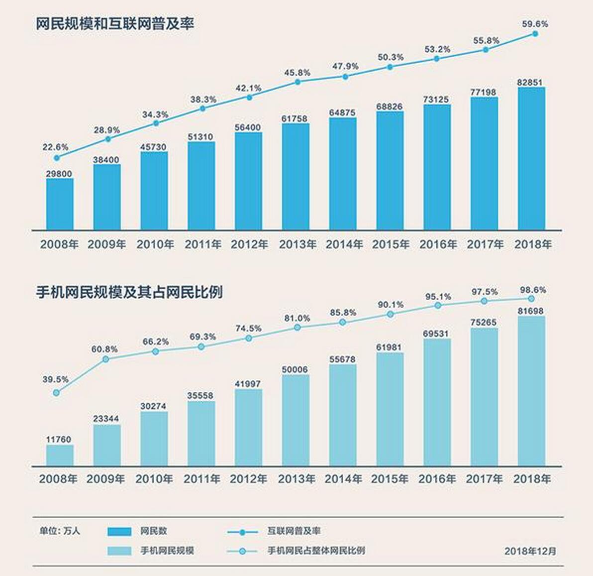 2019年2月28日,中國互聯(lián)網(wǎng)絡信息中心(CNNIC)發(fā)布第43次《中國互聯(lián)網(wǎng)絡發(fā)展狀況統(tǒng)計報告》。報告顯示,截至2018年12月,我國網(wǎng)民規(guī)模為8.29億,其中手機網(wǎng)民占比達98.6%,互聯(lián)網(wǎng)普及率達59.6%。上圖為網(wǎng)民規(guī)模和互聯(lián)網(wǎng)普及率。下圖為手機網(wǎng)民規(guī)模及其占網(wǎng)民比例。